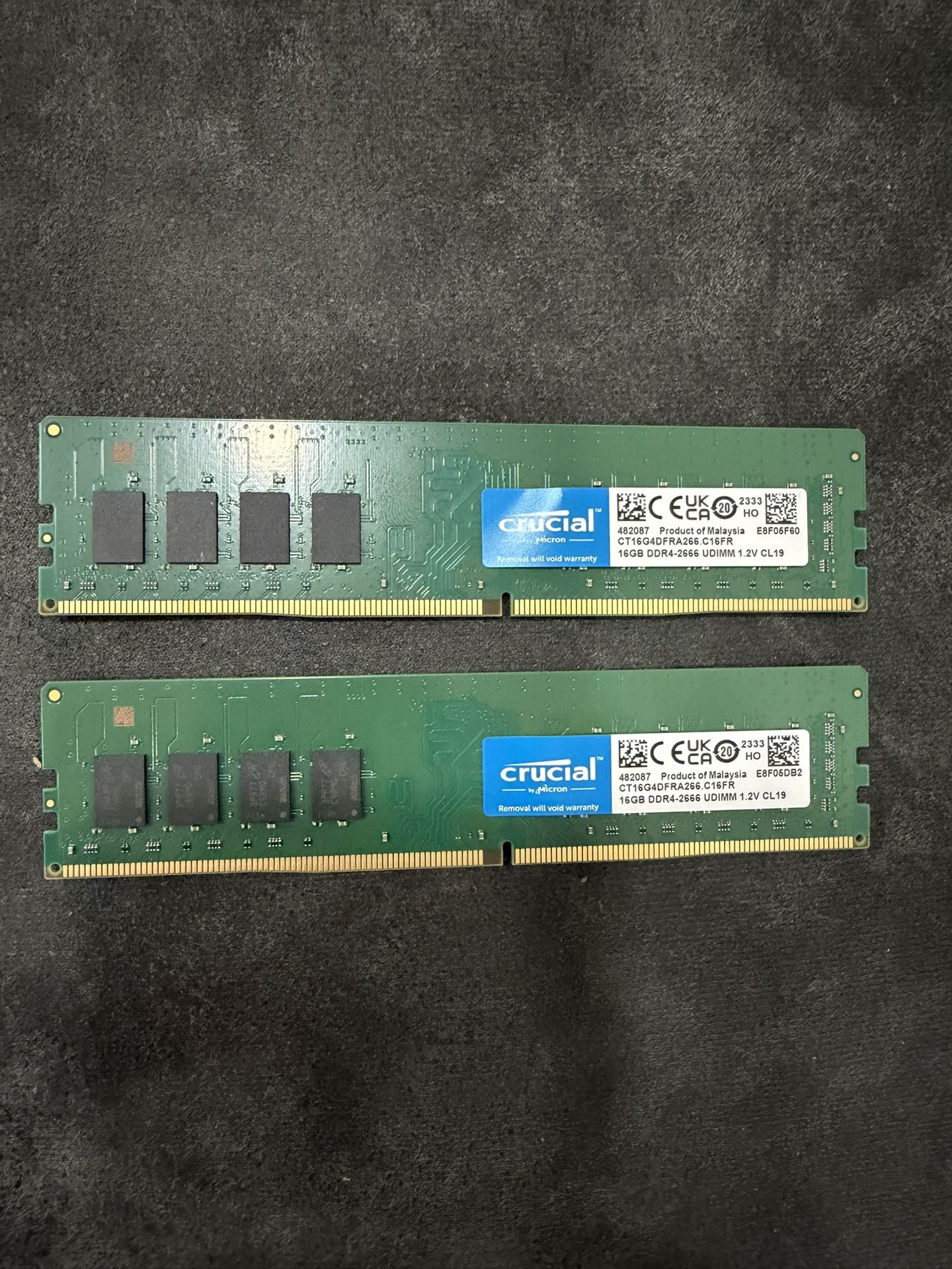 Product Specifications: • Total Capacity: 32GB (Two 16GB Modules) • Type: 288-pin DDR4 UDIMM (Desktop Memory) • Speed: 2666 MHz (PC4-21300) • Latency: CL19 • Voltage: 1.2V (Energy Efficient) • Model Number: CT16G4DFRA266.C16FR • Pulled from a working system.
