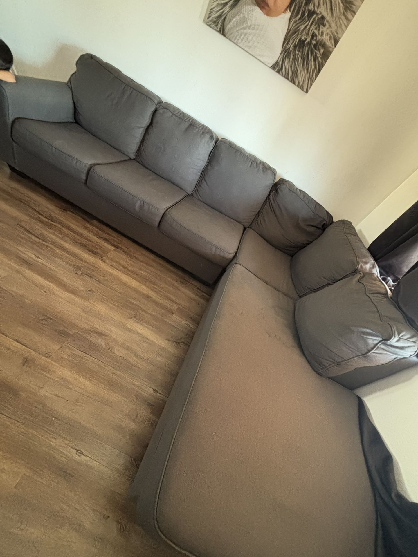 Sectional couch from living spaces. Purchased back in 2021 but just got a new couch so will need to let this one go. Dark gray color, fabric material as it is NOT leather. Does have some stains but they got darker and aren’t as noticeable but you can see on the photos. The bottom cushions can be removed to machine wash. Couch is in good condition no rips/tears but could use a wash. Pet free smoke free home. Pick up only I can’t deliver. Located in east mesa Ellsworth/broadway. 100 OBO need to sell asap.