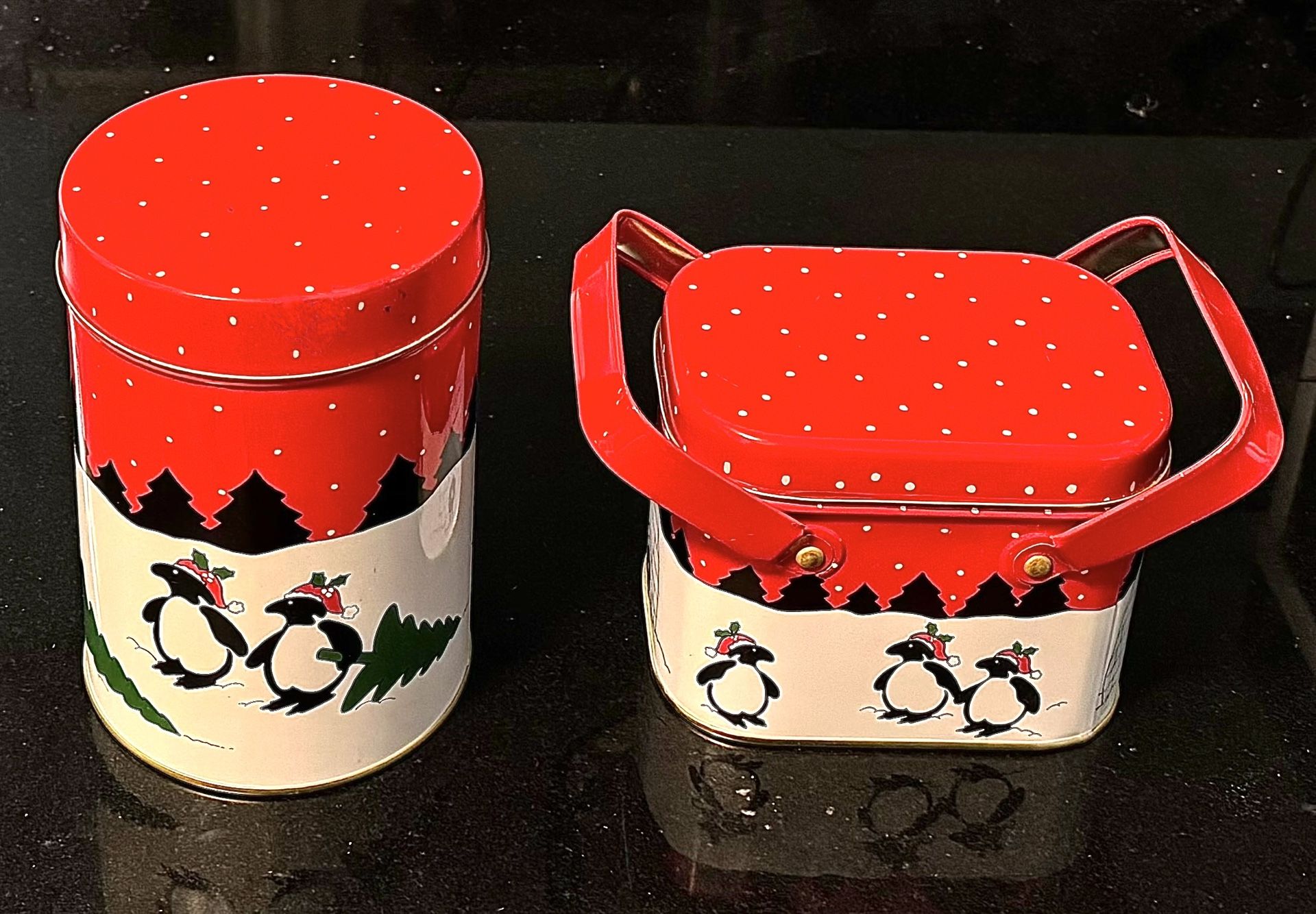 Original owner Brand new, perfect condition ✨only $3 for both 2 Matching Christmas/Holiday Tin Containers Holiday Scenes with Penguins Both have Lids One has Handles Gold tin interiors