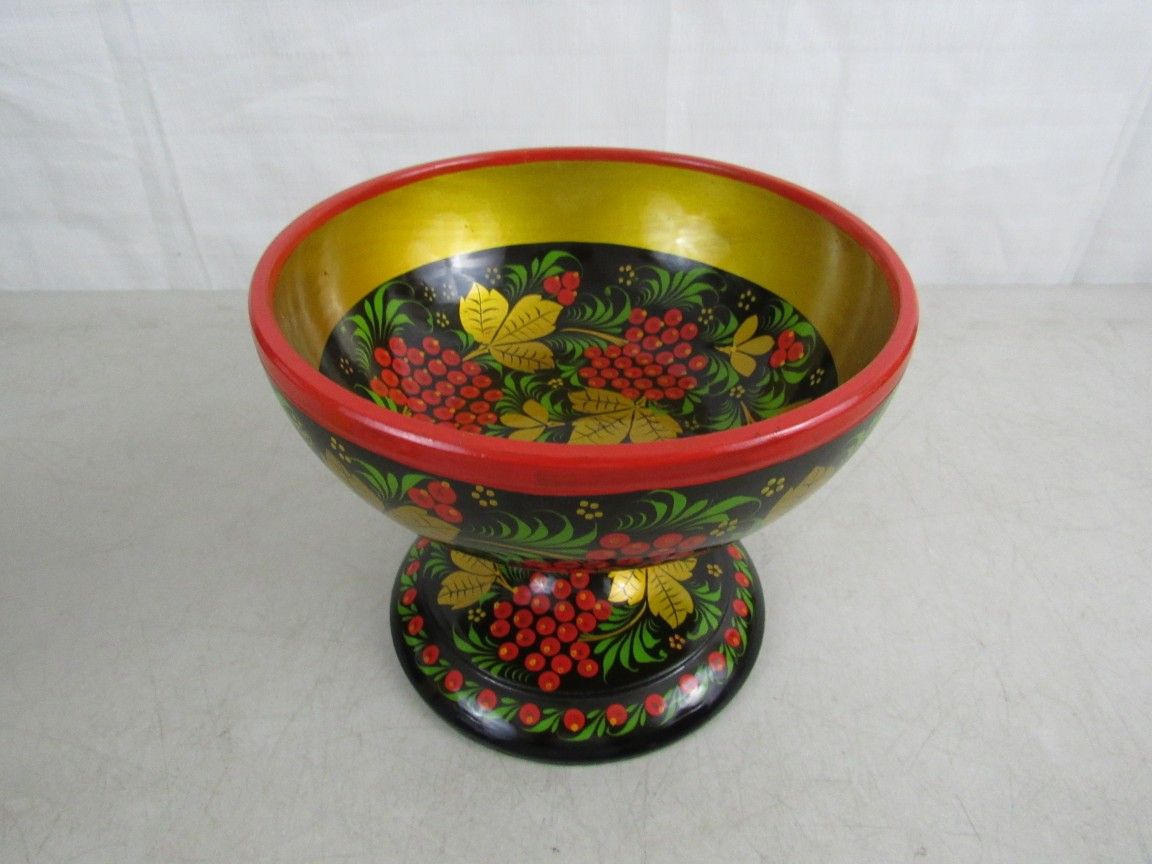 Khokhloma Russian Traditional Hand-Painted Fruit Wood Pedestal Bowl