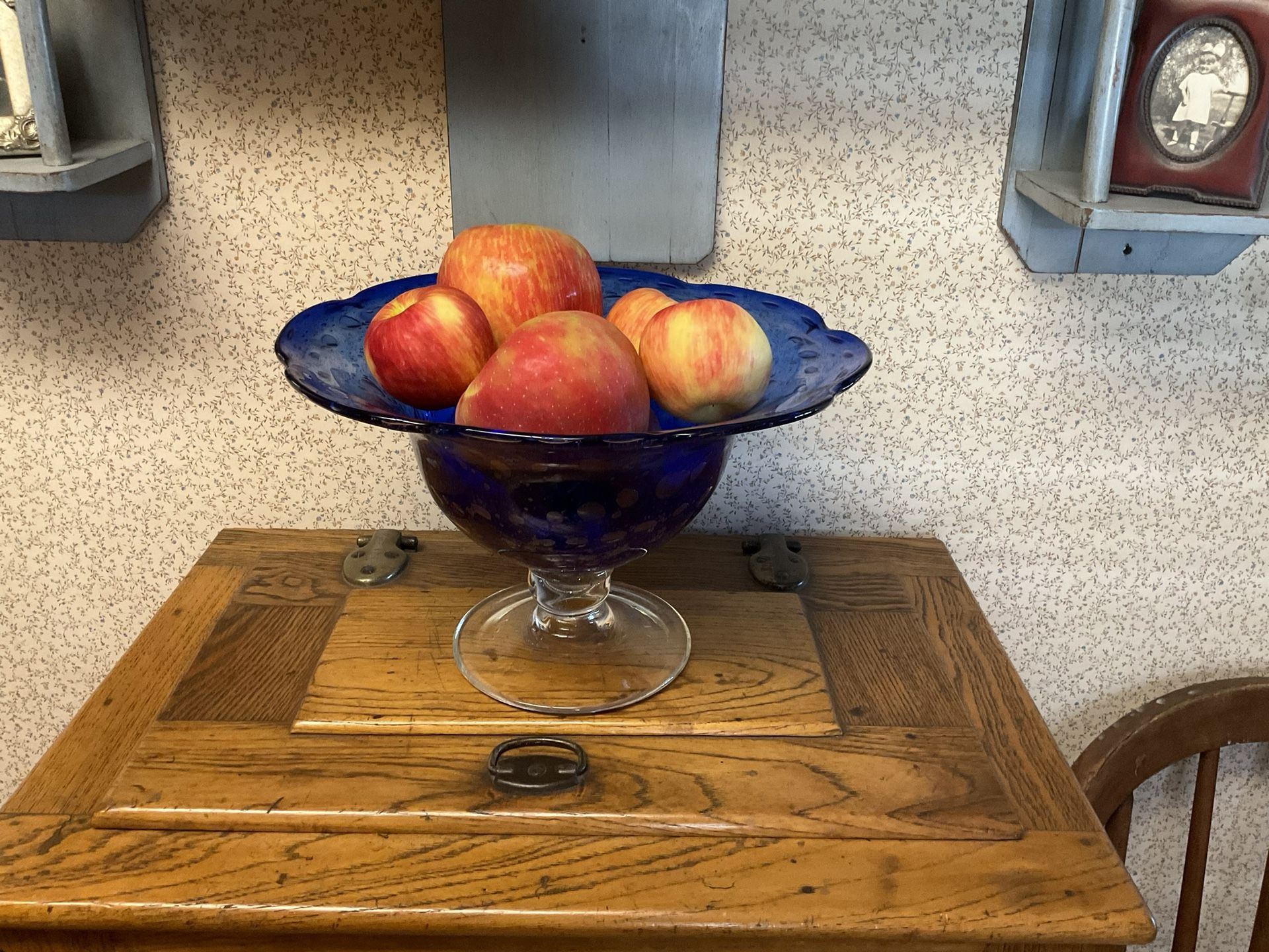 Gorgeous Vintage Hand Blown Cobalt Blue and Clear Pedestal Compote. Features a deep cobalt blue color scalloped rimmed bubble bowl with a clear glass pedestal base. Lots of beautiful bubbles in a one of a kind pattern! Its large size makes it an ideal for a fruit bowl, dining table centerpiece or just about anything you like. In nearly flawless condition. A nice addition a collection or just a fun piece on its own! The bowl portion measures 12” x 12” and the whole piece is 8” tall $12 cash preferred