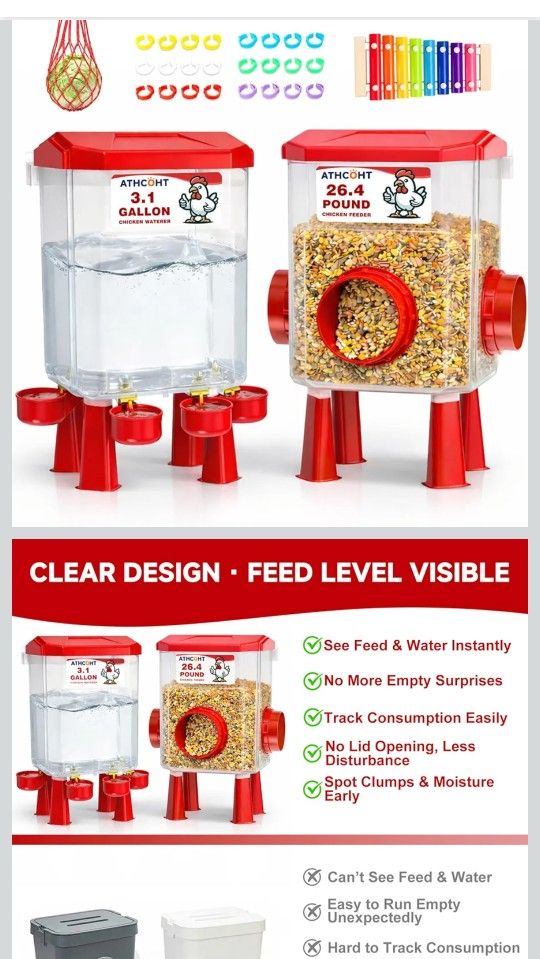 Large Chicken Feeder and Waterer Set 3.1 Gallon/26.4 Pounds, Automatic Chicken Waterer with 4 Cups & 3 Feeder Ports No Waste Poultry Feeders & Waterer