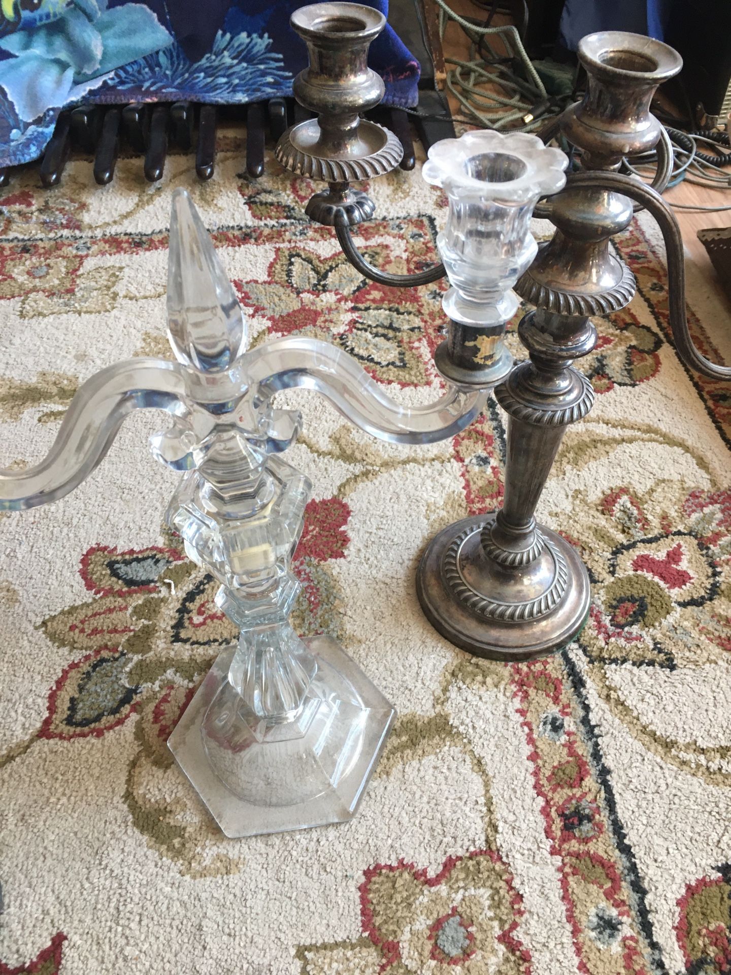 Vintage antique candelabras beautiful and heavy one looks to be silver and the other one is Crystal very neat looking for any decor