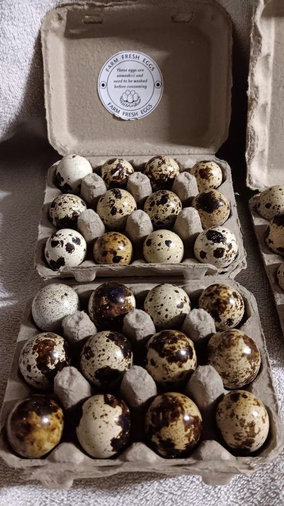 Organically raised fresh quail eggs, fed organic NON GMO feed , filtered water, grow lights and never medicated. 12 for $3 a dozen or $5 for 24 dozen. Cash only, You can text Steve at «show contact info» Huevos frescos de codorniz criados de forma ecológica, alimentados con pienso orgánico NO transgénico, agua filtrada, luces de cultivo y nunca medicado. 12 por 3 dólares la docena o 5 dólares por 24 docenas. Solo en efectivo, Puedes enviar un mensaje a Steve al