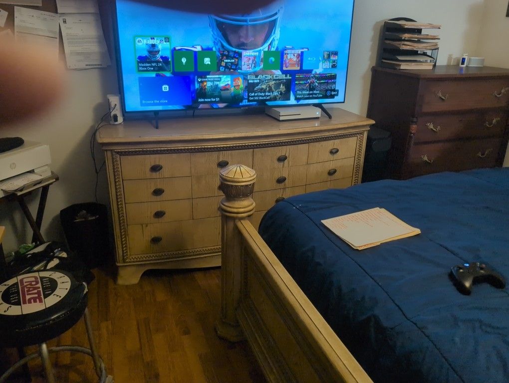King size mattress with frame and 2 box springs , with one dresser .. all is used but looks good and is in good shape. Beauty reset mattress is very comfy. There are a couple markings on the dresser but drawers all glide in and out smoothly.