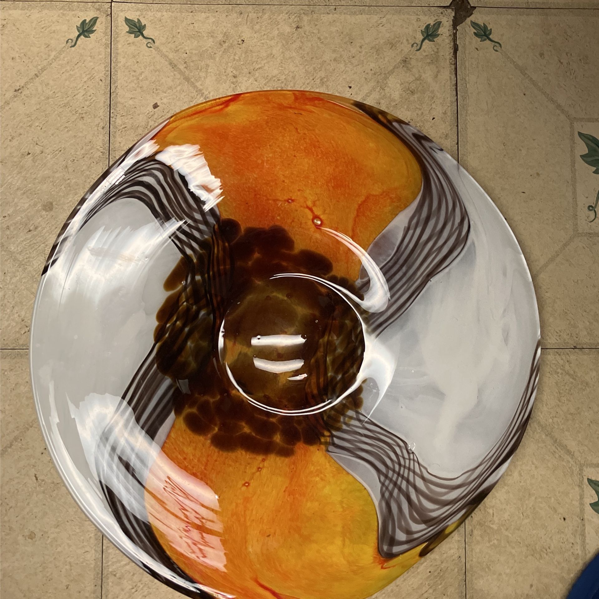Heavy (approx 10lb), footed handmade / decorated Polish glass platter. Approx 16” diameter (not a perfect circle). Unique pattern and vibrant color. No chips/cracks- perfect condition.
