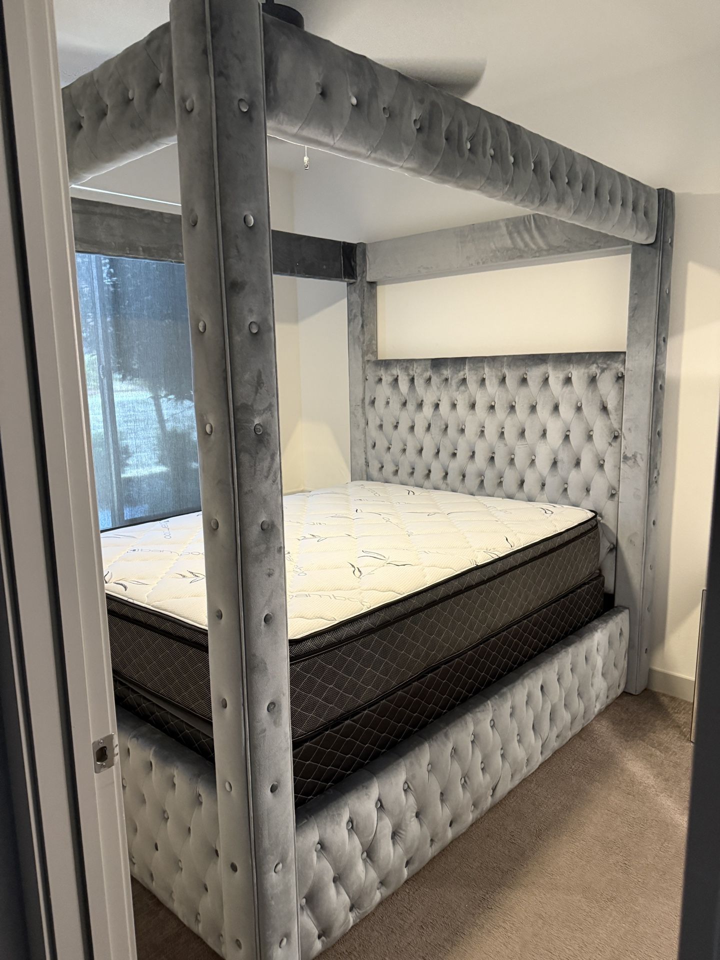 Elegant Tufted Suede Canopy Bed Frame Stylish canopy bed frame with a soft suede upholstered headboard and beautiful tufted design. Very sturdy and adds a luxurious look to any bedroom. ✔ Tufted suede headboard ✔ Modern canopy frame design ✔ Strong and durable ✔ Great centerpiece for bedroom décor Size: QUEEN Condition: Excellent Price: $500 Pickup: Local pickup ONLY!