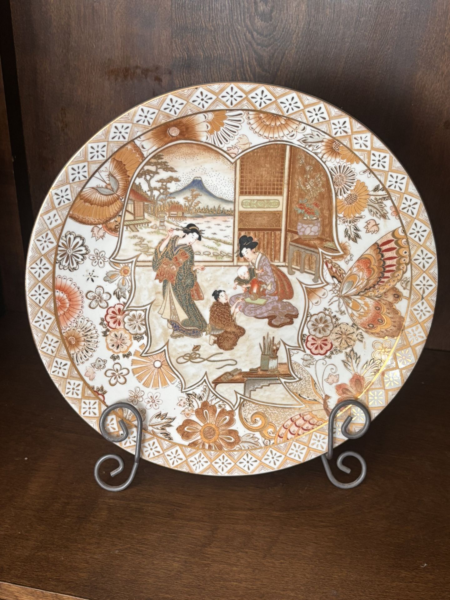 Plate Paint painted Gold trim Geisha female women Scenery Home decor On metal decorative stand