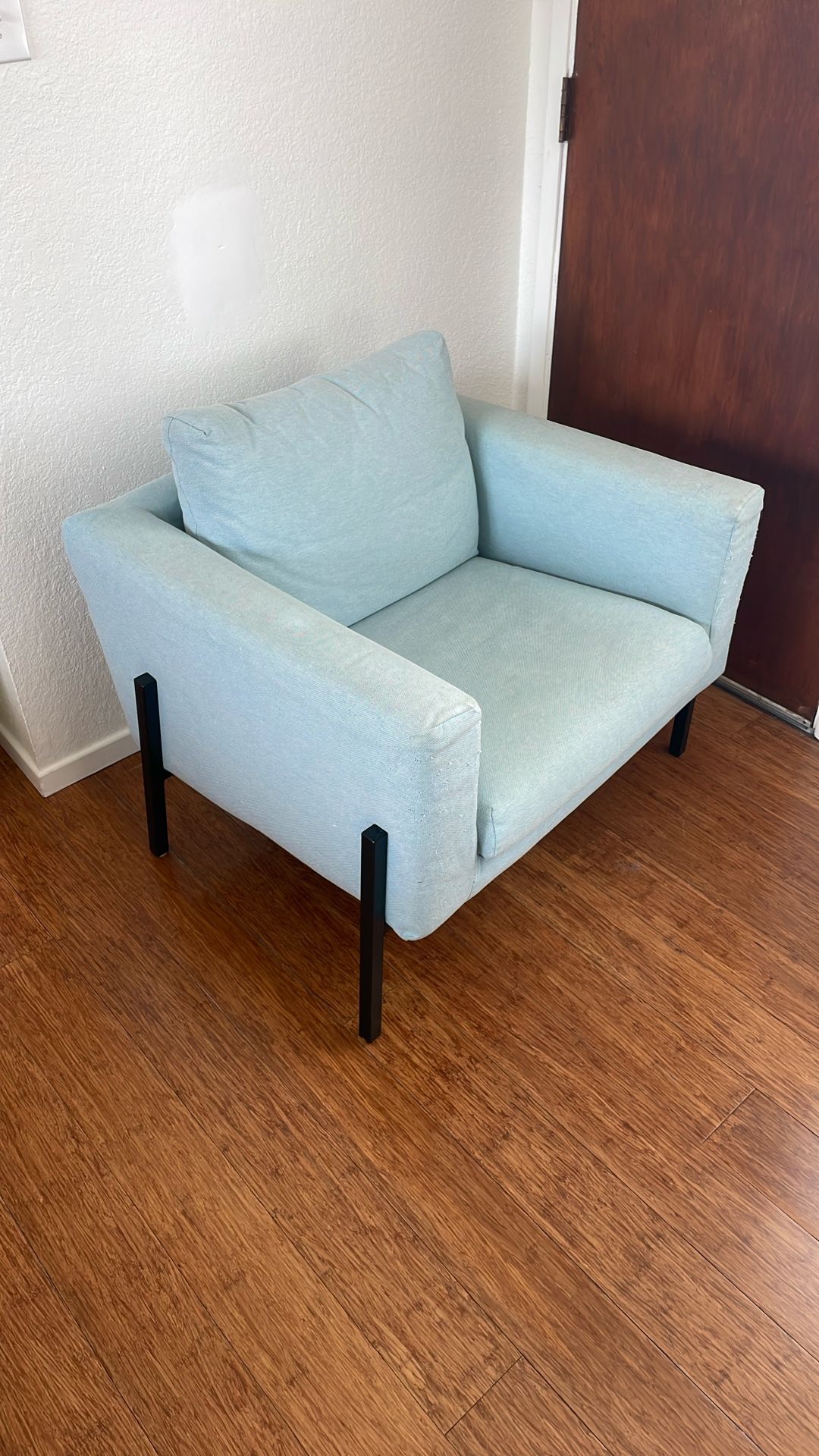 31” Wide, 30” Deep, 25” Tall Blue Loveseat with black metal feet.