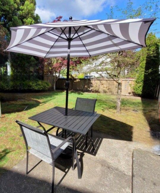 Has rust spot (pictured) Can use tablecloth to hide it. Chairs not included. Only sold as a bundle