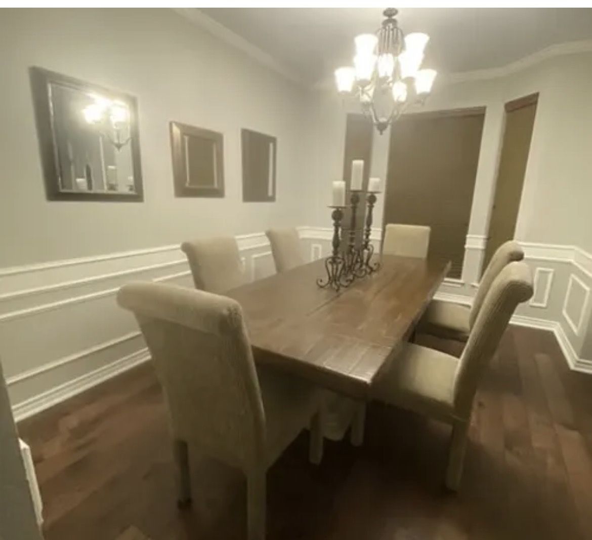 Stunning rectangular dining table with 6 upholstered parsons-style chairs. Rich dark walnut finish with beautiful wood grain detail. Chairs are covered in a durable beige/tan fabric with a classic rolled-back design — comfortable and stylish. Details: ∙ Seats 6 comfortably ∙ Solid wood construction ∙ Dark espresso/walnut finish ∙ 6 matching upholstered chairs (beige fabric) ∙ Great condition Perfect for a formal dining room or everyday family meals. Moving and need it gone — your loss is my gain! Local pickup only. Cash, Venmo or Zelle accepted.