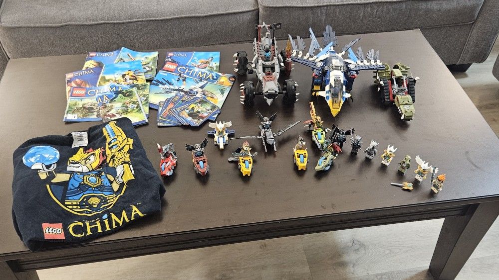 Older lego chima lego sets no box with manuals vehicles and mini figures and also lego chima tshirt adult size medium message if interested cash or zelle only