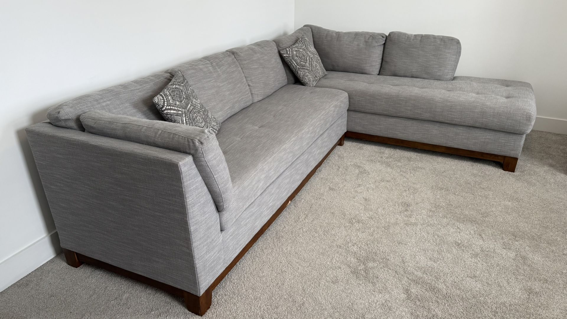 Grey sectional couch from American Signature. Only used for 1 year because we have another couch. Selling because we are downsizing to a smaller house. It does have a scratch on the bottom of the couch from moving. Open to offers. Pick up only