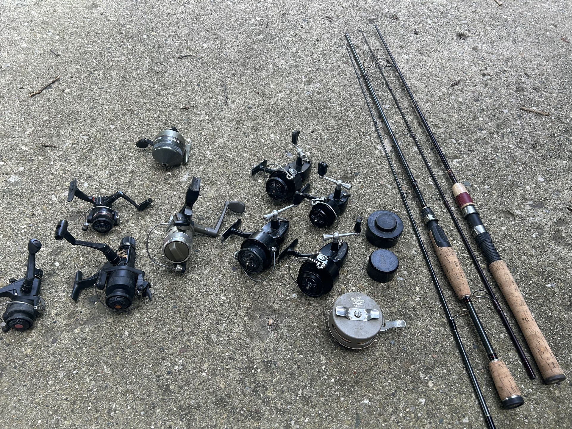 Have 3 Mitchell 300 reels. 1 Mitchell 308 reel. Extra spools. Old Shakespeare ok automatic fly reel. 1 quantum h3 hypercast. 2 shimano reels, one is a rapid fire cast. 1 Diawa ultra light reel. One Zebco 202 closed face reel. Two 6’6” rods.