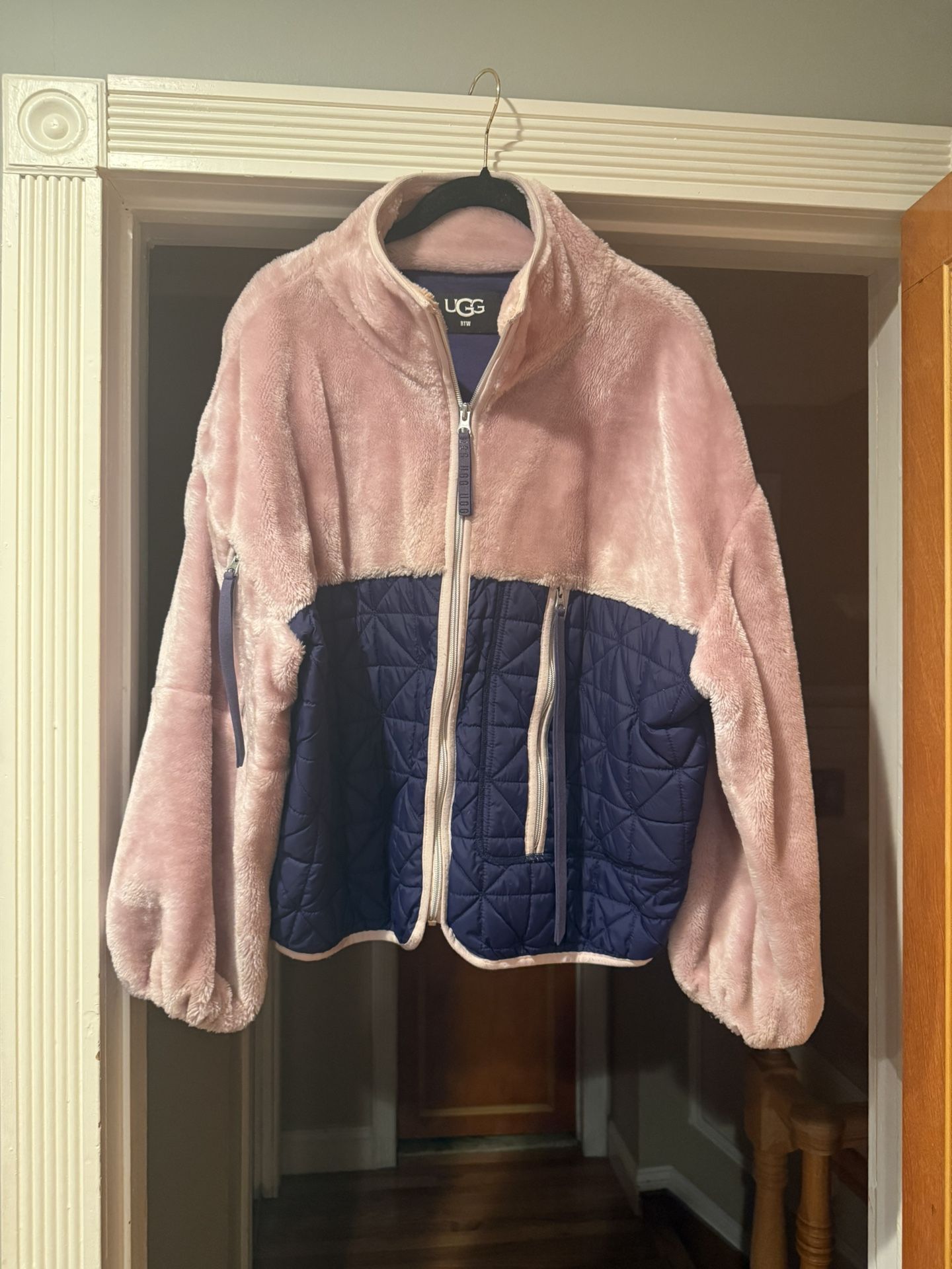 UGG Marlene Fitted Quilted Fleece Jacket in Pink / Purple Size Medium — COZY!!! Preowned. In EXCELLENT condition!!! Looks brand new!!!. Cozy up in this UGG teddy jacket. Soft pink with bold blue accents. Perfect for chilly days. Fabric Content: Shell 100% Polyester Contrast Fabric 100% Nylon Lining/Pocket Bags 100% Cotton