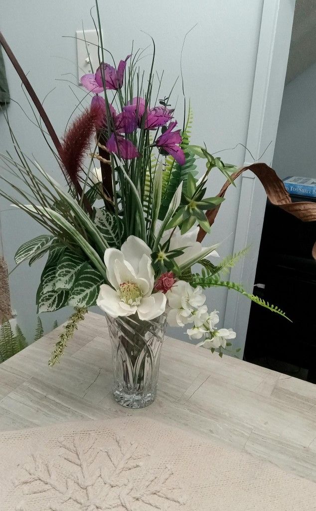 Beautiful Artificial Floral Arrangement (with Unique Glass Vase)... Used-Good Condition. Comes with pieces attached and Ready for Display... This One-Of-A-Kind Hand-Crafted Creation, has vivid Colors, Accented Foliage and an expressive Artistic Design. Approximately 19 in. High and 14 in. Wide.
