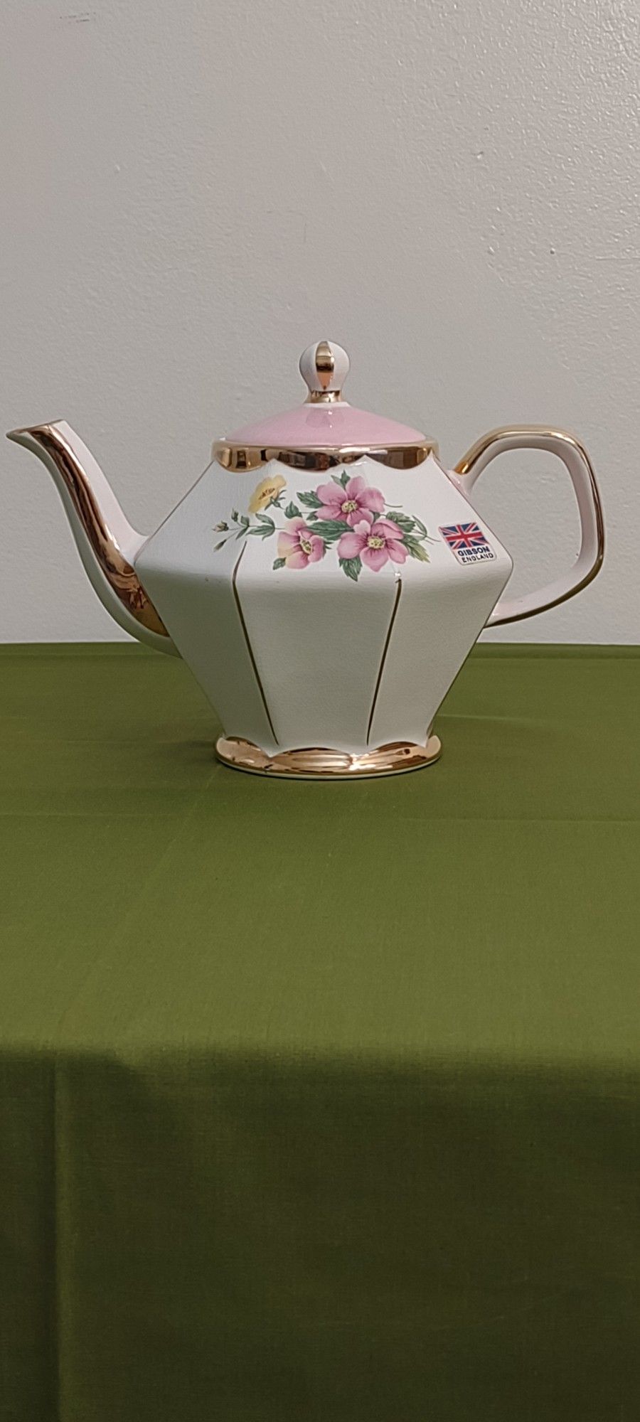 Pretty flower motif with rose pink stripes and gold accents. Made in england. 6 inches high, 9 1/2 in from spout to handle. No chips, cracks or repairs. Some age appropriate crazing under glaze.