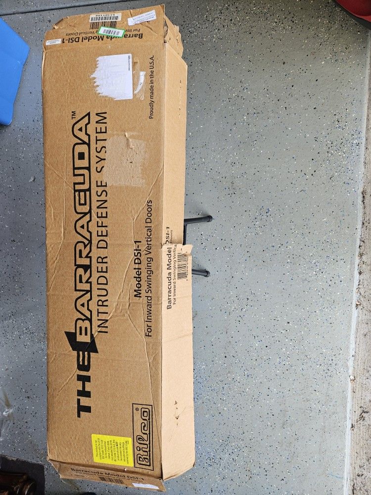 The Barracuda™ Intruder Defense System For Inward Swinging Commercial Doors - DSI-1 Model # WBB1581418 The Bilco® Company has teamed up with Troy Lowe, a military veteran and SWAT team member, to manufacture door security devices that he designed based on his experience as a law enforcement professional and an active-shooter training instructor. These locking devices can be installed in a matter of seconds in emergency situations to protect occupants against building intruders. The user places the device on the floor and slides the metal plates under the door. Pushing outward on the handles engages the plates to the exterior door jam, and the device is securely locked in place by simply inserting a pin. Width 40-3/16 in Depth 5-1/4 in Height 12-1/16 in Weight 11 lbs Benefits: Fast and easy; installs in a matter of seconds Securely locks an entry point in a lock-down situation Free-standing device (not permanently attached to the door). Can be easily transferred to another access point No maintenance or installation costs are required Less expensive than locksets and much more secure than small devices Made in America Features: Designed for use on 36" wide commercial doors Heavy-duty steel construction Durable powder coat paint finish Lightweight for easy positioning Supplied with convenient wall-mounting rack