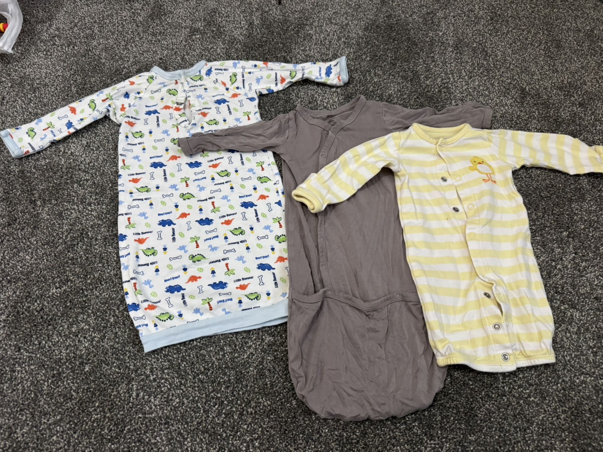 Yellow duck baby sleeper is newborn. Grey sleeper is 0-3 months. Dinosaur sleeper is 0-6 months up to 16lbs. $1 each