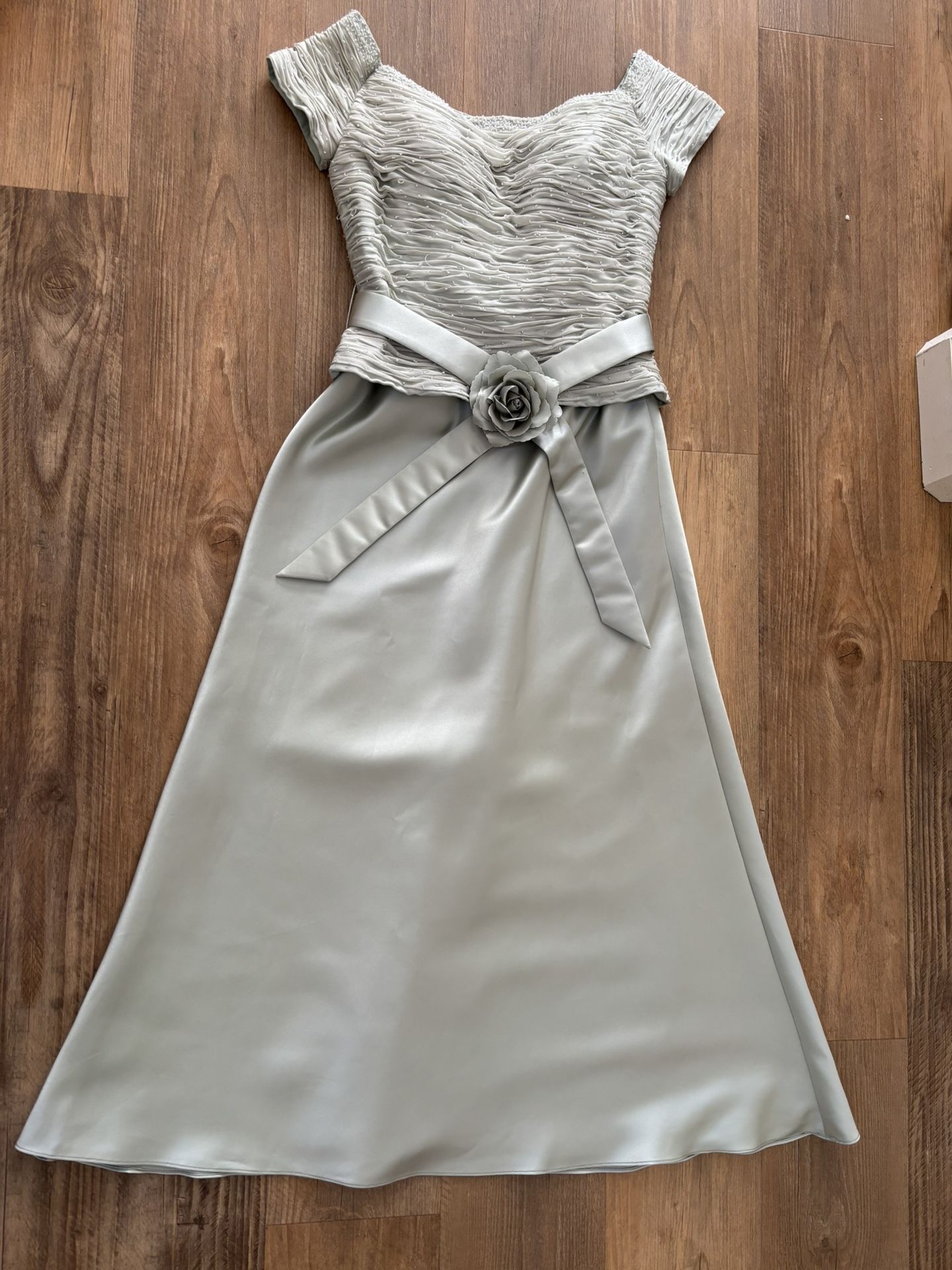 Size 10 - A-line floor length gown is perfect for prom, wedding or any formal occasion. Its enchanting mint green hue with cap sleeves and little beads on upper portion is elegant and sophisticated. Worn once, recently dry cleaned with no stains or snags.