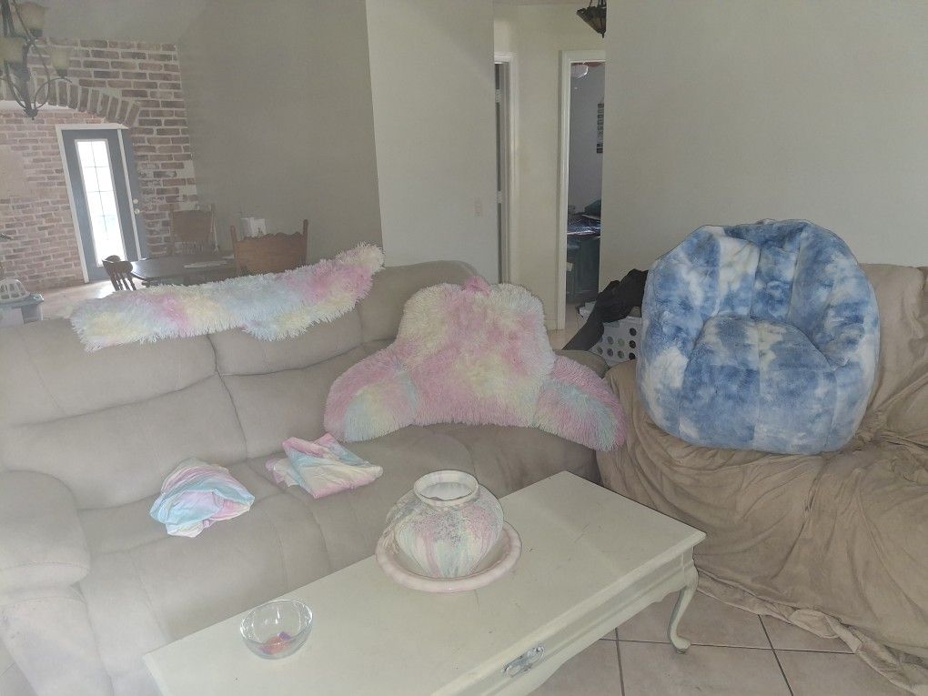 Sheet set matching blanket and giant pillow. Plus blue fluffy tv chair!!