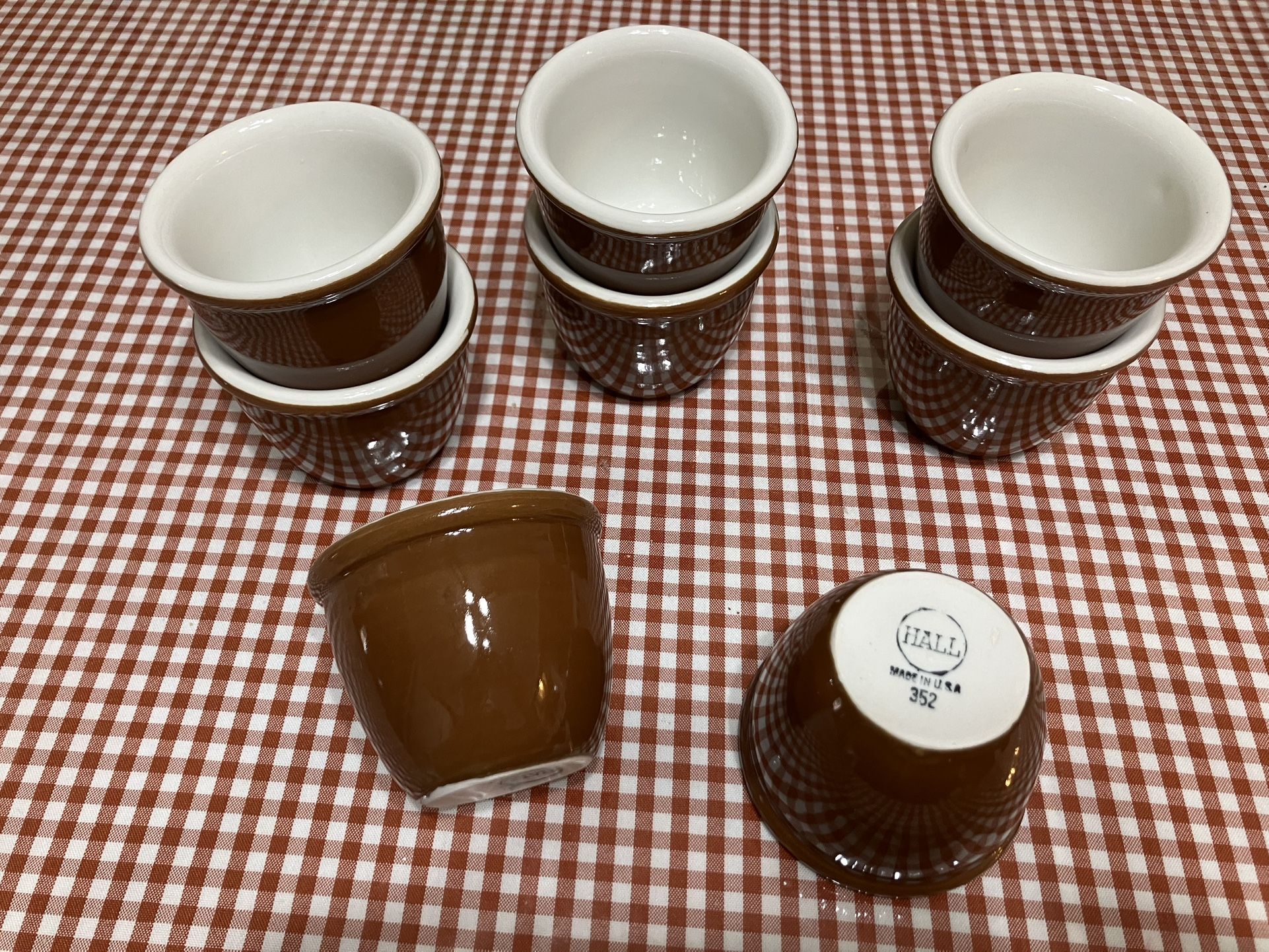Hall 352 brown restaurant grade, 3” tall ramekins. Heavy duty in like new condition. Two sets of 4 available. Set of 4 is $30.