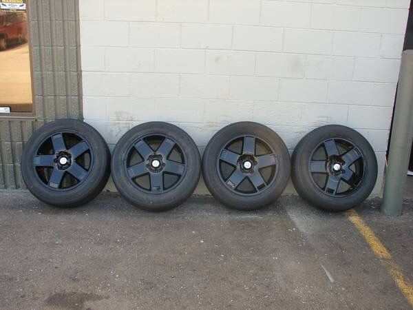 18" all black dodge chrysler oem rims all season tires mounted all four have been reconditioned all four center caps included see pics 5x115 5x4.5 5x114 bolt lug pattern will fit all wheel drive models dodge chrysler product dodge charger chrysler 300 300c magnum jeep patriot compass cherokee nitro $499 for the complete set of wheels and tires installed! trade-ins welcome STOCK # DOD059