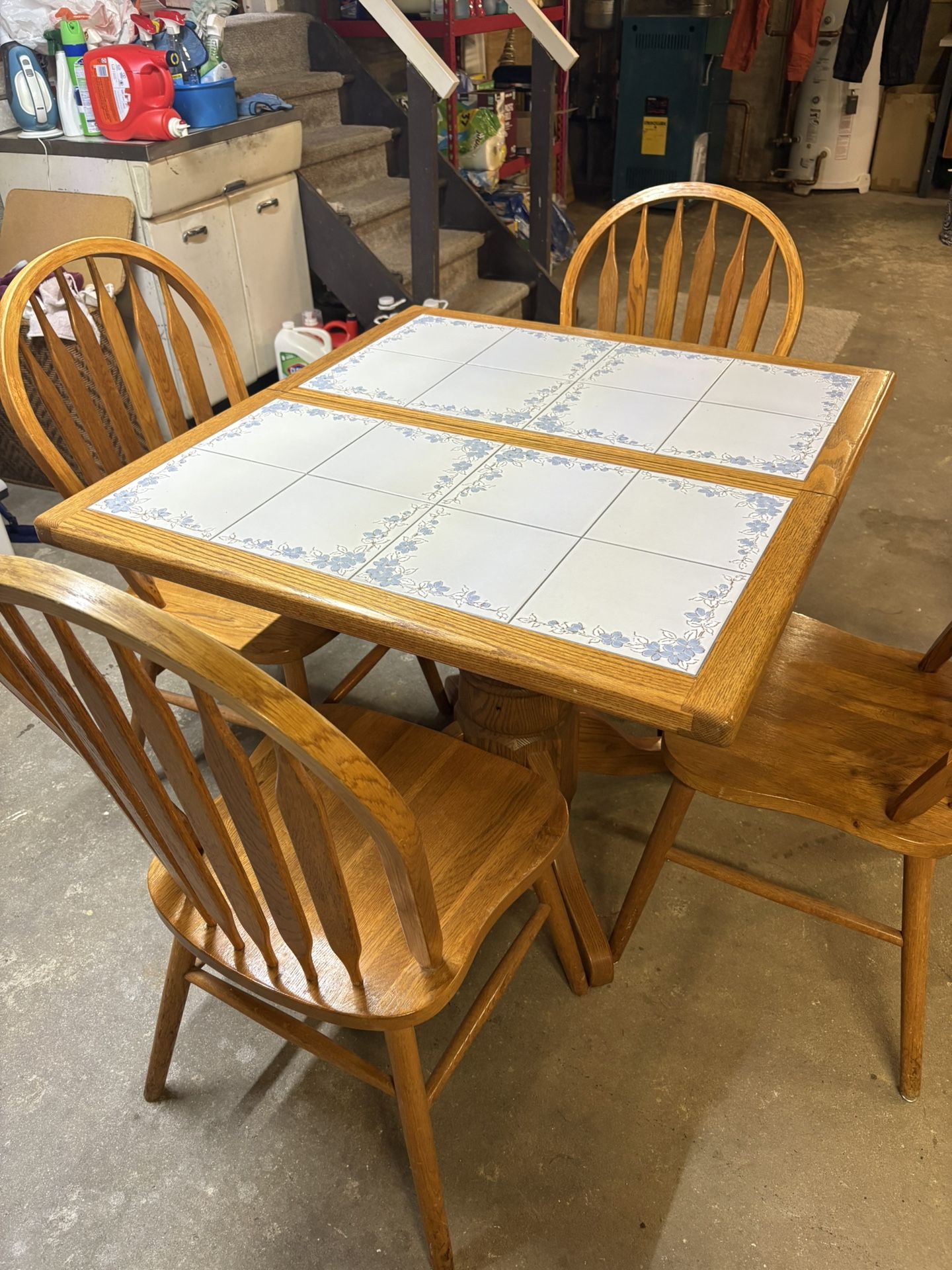 Solid light oak with tile inset kitchen table, and four matching chairs. Very clean and in good condition. Table measures 36x38 and 36x56 with leaf