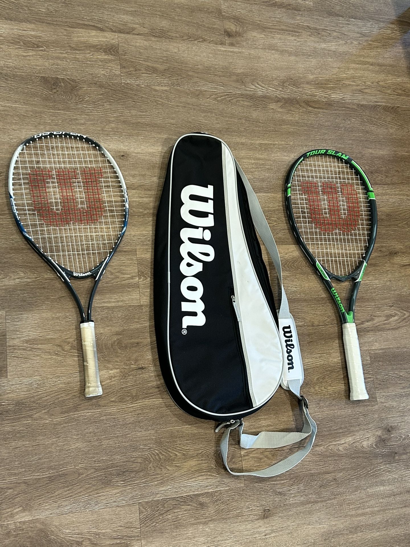 I have a 2 Wilson Tennis Rackets & a Bag for sale. Can be used by kids, teens or adults. In great shape, barely used and has been sitting in storage. Blue racket has been used a bit and is $15. Green racket is unused with plastic still on the racket and is $30. Bag is $15 or $25 with blue racket or $40 with green racket.