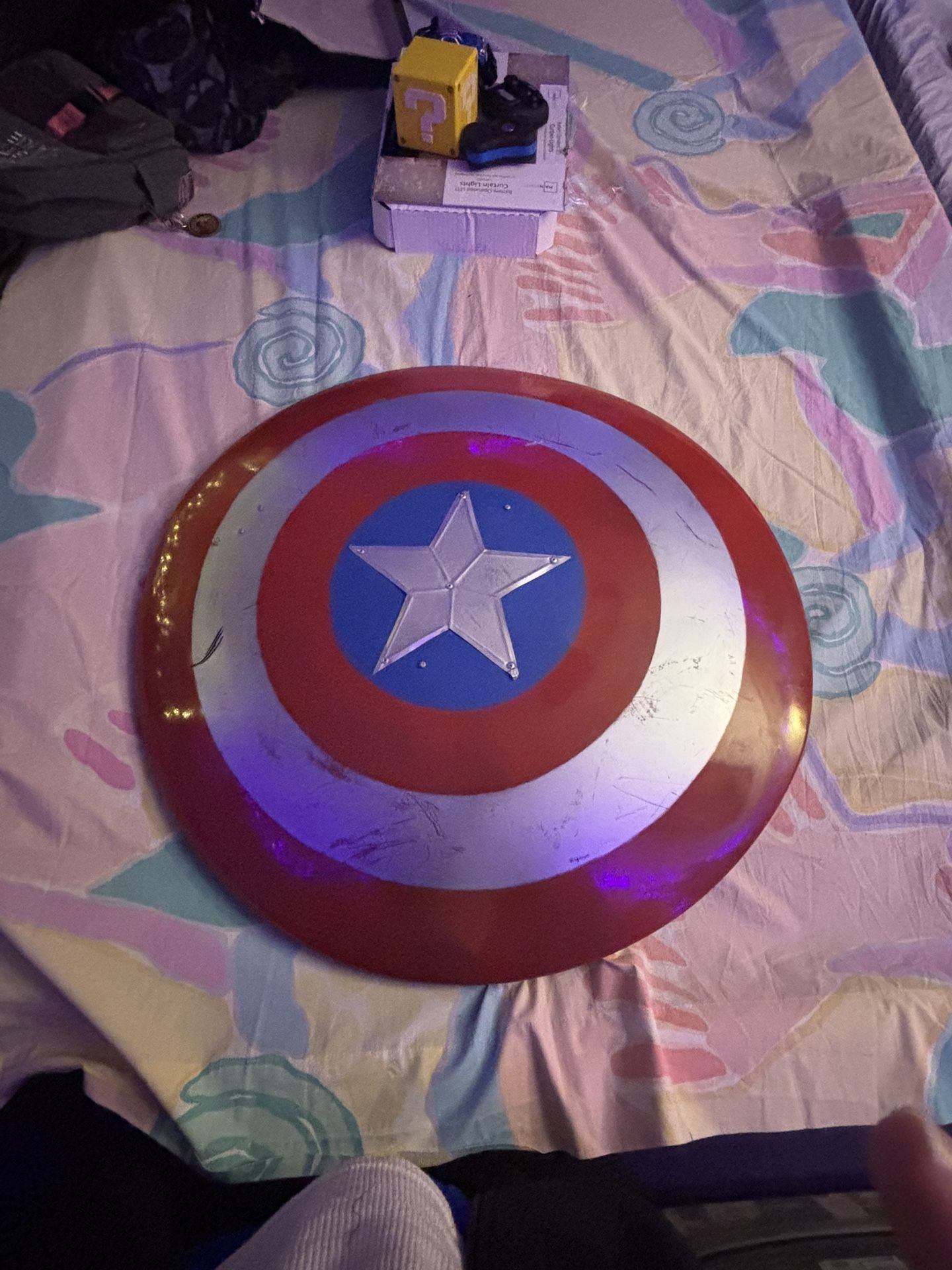 Has some scratches on it but for the most part solid metal, had an arm guard and strap to hold it on the back, pretty sold and weighted