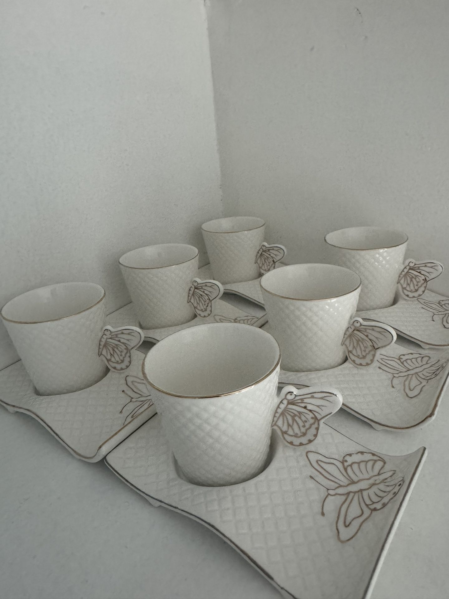 NOUR 12 piece tea set gold butterfly bone china 6 cups and 6 saucers, no chips or cracks in extremely good condition. these are not big, its about two oreos long. i inherited my grandmothers china collection but i dont have the space and i rarely use these as i dont drink tea or coffee. its really hard to part with them bc they're really pretty and i love butterflies but they're just sitting here collecting dust ): PRICE VERY FIRM ON THIS ONE. Everything on my page is $20 or less! (with the exception of an item or two) check it out and ill give you a better deal if you take multiple items! 🫶🏻 PICKUP in Alhambra, cross streets are Mission and 4th. If its up its available. Please message me only if you have a time and date you want to pick up or questions regarding the items. No need to ask if its available. cash only!