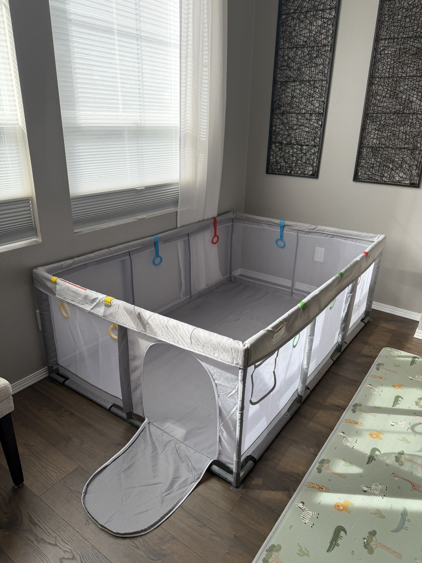 Large baby playpen in good condition. Used for about 3 months. Mesh sides are in great shape with no holes, and the zipper door works properly. Includes the pull rings on the sides (shown in photos) that we purchased separately so kiddo could practice standing. Details: • Size: 74” x 50” • Mesh sides • Zipper door works • Pull rings included • No mat included Notes: One connector has a small crack but it does not affect setup or use. Toys and play mat shown in photos are not included, playpen only. ✨ If the post is up, it’s available. First person who can pick up gets it. Thanks! From a smoke-free, pet-friendly home. The playpen is disassembled for pickup (pictured in blue bag). I do not have the instructions, but they can likely be found online. 💵 $20 cash firm 📍 Pickup near Home Depot, Issaquah Original product for reference: https://offerup.com/redirect/?o=aHR0cHM6Ly93d3cuYW1hem9uLmNvbS9Gc2hpYmlsYS1QbGF5cGVuLVRvZGRsZXJzLUJyZWF0aGFibGUtQW50aS1GYWxsL2RwL0IwQzVRWFBGS0I= Keywords: baby playpen, baby play yard, toddler playpen, large baby playpen, mesh playpen, baby fence, indoor playpen, play yard