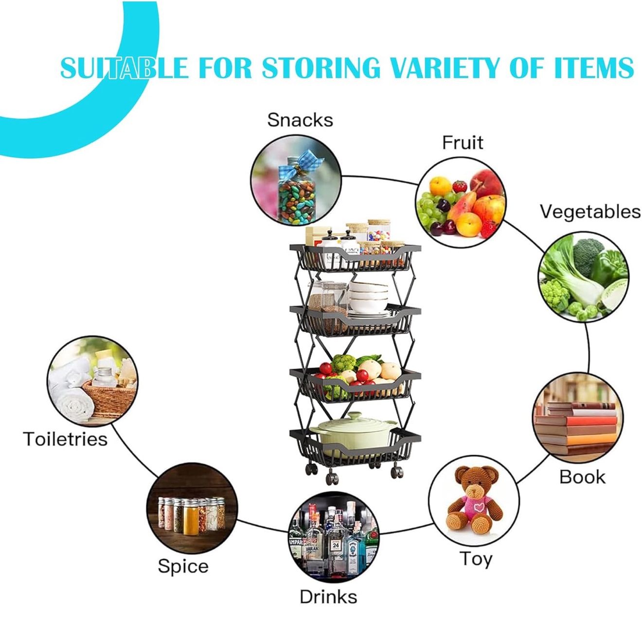 Fruit Vegetable Storage Basket 4 Tier Kitchen Storage cart on Wheels Foldable Rolling Storage Cart for Kitchen, Bathroom, Pantry