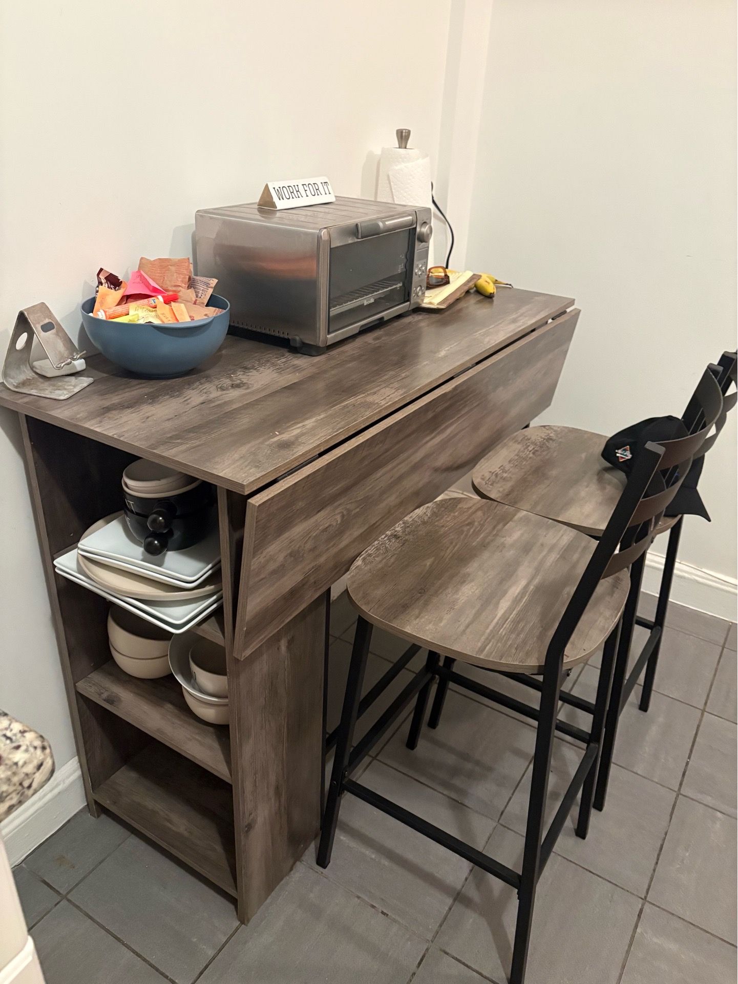 Amazon kitchen dining set β counter/bar height table in gray weathered wood finish with built-in 3-shelf storage on one side (great for small apartments). Comes with 2 matching metal ladder-back bar stools. Bought 2022, good condition with normal use wear. Perfect for a studio or small kitchen. π 11101 LIC/Long Island City β 5th floor walk-up, NO elevator. Bring help. Take as-is, no disassembly. β Moving end of April. First to confirm with a real pickup window gets priority. Tags: dining table set, bar height table, counter height dining, kitchen table with storage, 2 stools included, small apartment dining, industrial style furniture, Amazon furniture, Queens furniture, LIC moving sale, NYC apartment furniture