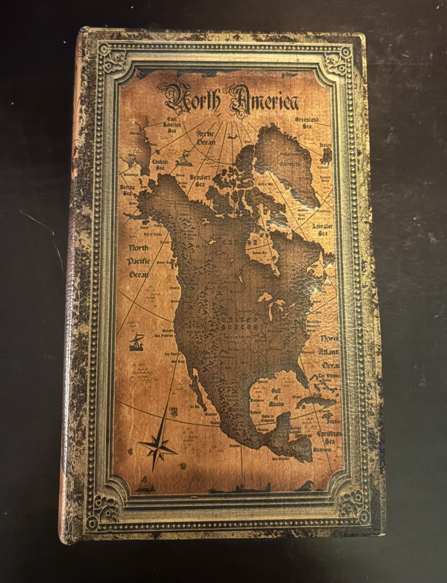 This is a vintage-style decorative book box or journal featuring an embossed map of North America. The cover has an antique, leather-like appearance with detailed, raised relief of the continent and surrounding ocean names. Product Information Type: Decorative storage box, keepsake box, or journal. Material: Often made from wood or cardboard and covered with faux leather or canvas with gold embossing for an antique look. Style: Vintage, antique map, travel, or "treasure chest" style. Use: It can be used for storage of keepsakes, jewelry, or as a functional notebook/diary, depending on the specific product's design. 8.5 x 5.5 x 2 PLEASE CHECKOUT MY OTHER ITEMS, I WILL OFFER A MULTI ITEM PURCHASE DISCOUNT!