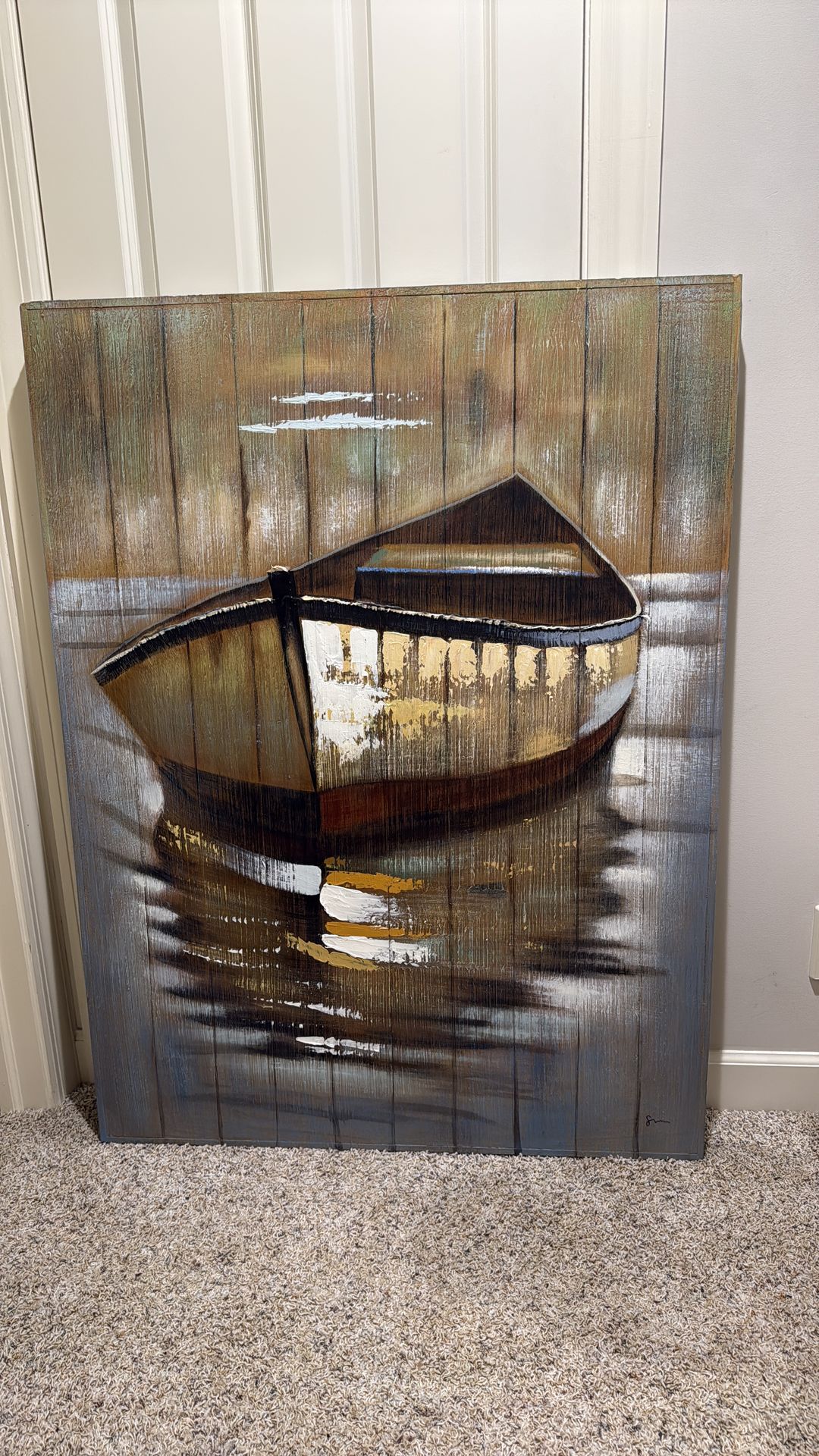 *New* Beautiful oversized rustic wall art featuring a rowboat on water with textured, dimensional detailing. The artwork is painted on vertical wood panels, giving it a farmhouse/coastal feel with warm neutral tones (tan, cream, brown, gray, and soft blue reflections). • Purchased from At Home • Original price: $149.99 • Large statement piece • Wood panel construction • Neutral colors work with farmhouse, lake house, coastal, or rustic decor • Excellent condition This is a great focal piece for a living room, entryway, bedroom, or lake house. Selling for less than retail.