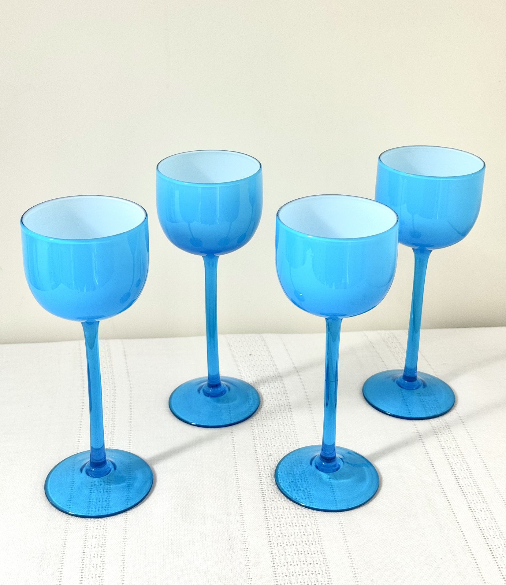 Vtg Carlo Moretti Turquoise & White Tall Stem Wine Glasses, Set of 4 Italy 1960s