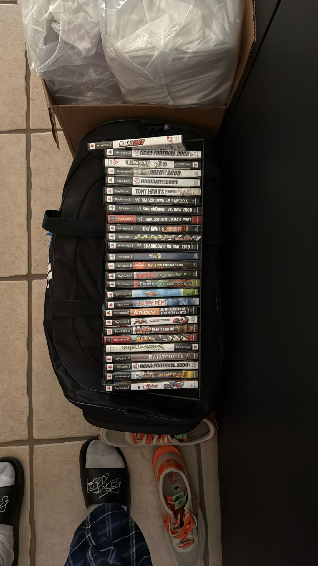 $50 OBO WANT THEM GONE HAVENT BEEN TESTED AS I HAVENT HAD A PS2 IN PROBABLY 10 YEARS, COMES AS IS Smackdown vs Raw 2007 Cases are Empty Games Include: - NBA 2K7 - NCAA Football 2003 - NCAA Football 2004 - Backyard Football 2006 - Backyard Baseball 2010 - Madden 2003 - Madden 2004 - Tony Hawk’s Proving Grounds - Smackdown vs Raw 2008 - Smackdown vs Raw 2010 - Tony Hawk’s Underground - Spongebob Squarepants Lights, Camera, Pants - Spongebob’s Atlantis Squarepantis - Nickelodeon Battle For Volcano Island - Rampage Total Destruction - Charlie and The Chocolate Factory - Over The Hedge - Happy Feet - Nickelodeon Attack Of The Toy Bots - Power Rangers 10th Anniversary - Sprint Cars Road To Knoxville - Madagascar - Shrek The Third - Shrek Smash and Crash - Ratatouille