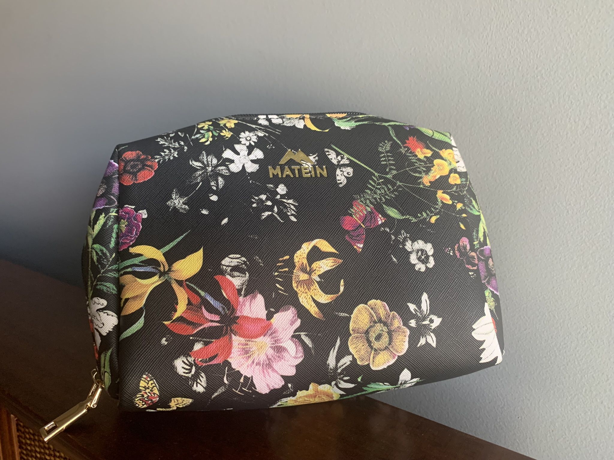 Black floral Waterproof PU Leather CLUTCH BAG, COSMETIC CASE, TRAVEL POUCH. NWOT