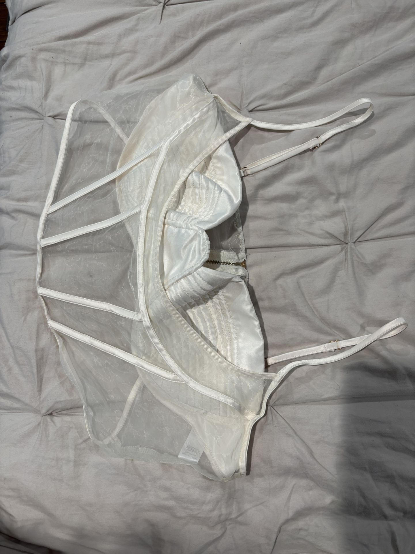 Beautiful white mesh corset-style top with sheer boning and satin cup detailing. Adjustable straps. Super feminine and trendy look — perfect for layering, styling, or photo shoots. ⚠️ NOTE: Two small holes on the bust seam (pictured). Price reflects the damage. Great for creative styling or upcycling.