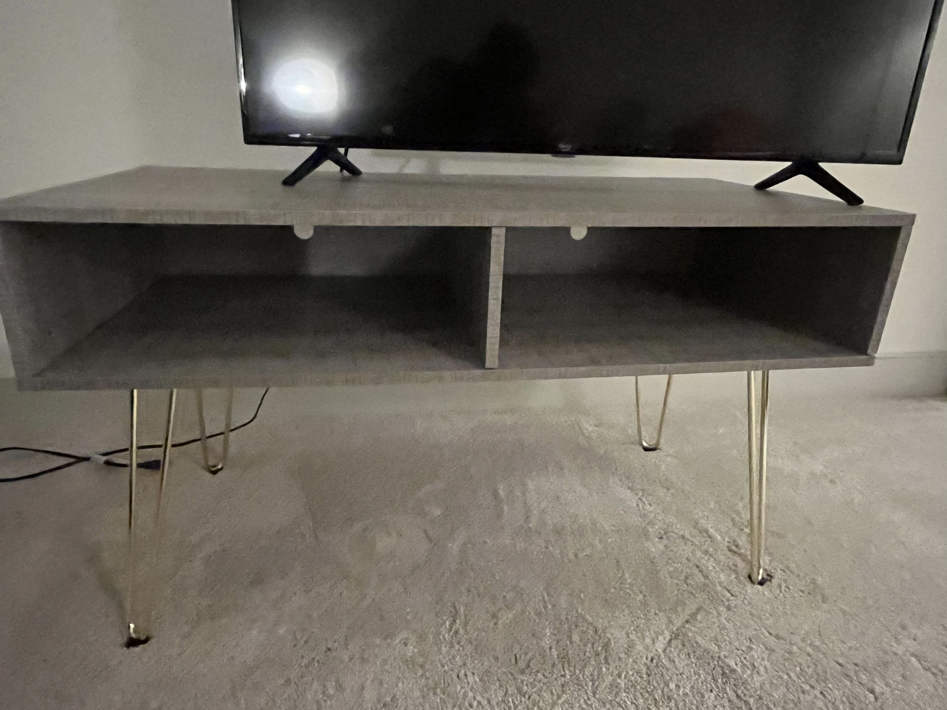 Beautiful tv stand with grey & brown grain with gold legs in excellent condition. This stand holds TVs up to 50”