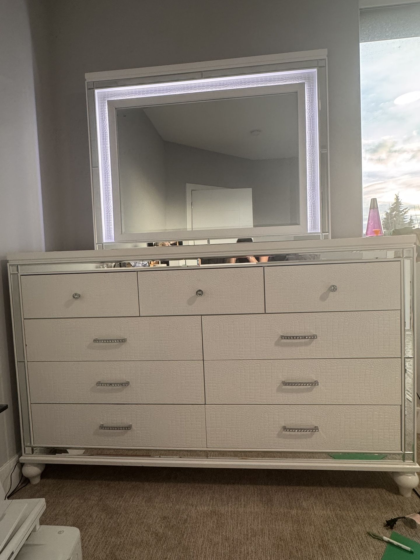 White mirrored dresser with LED mirror. Lots of storage, sturdy, and lights work great. There’s some cosmetic wear on the top surface from the wood finish (see photos), but everything functions perfectly. Pickup only.