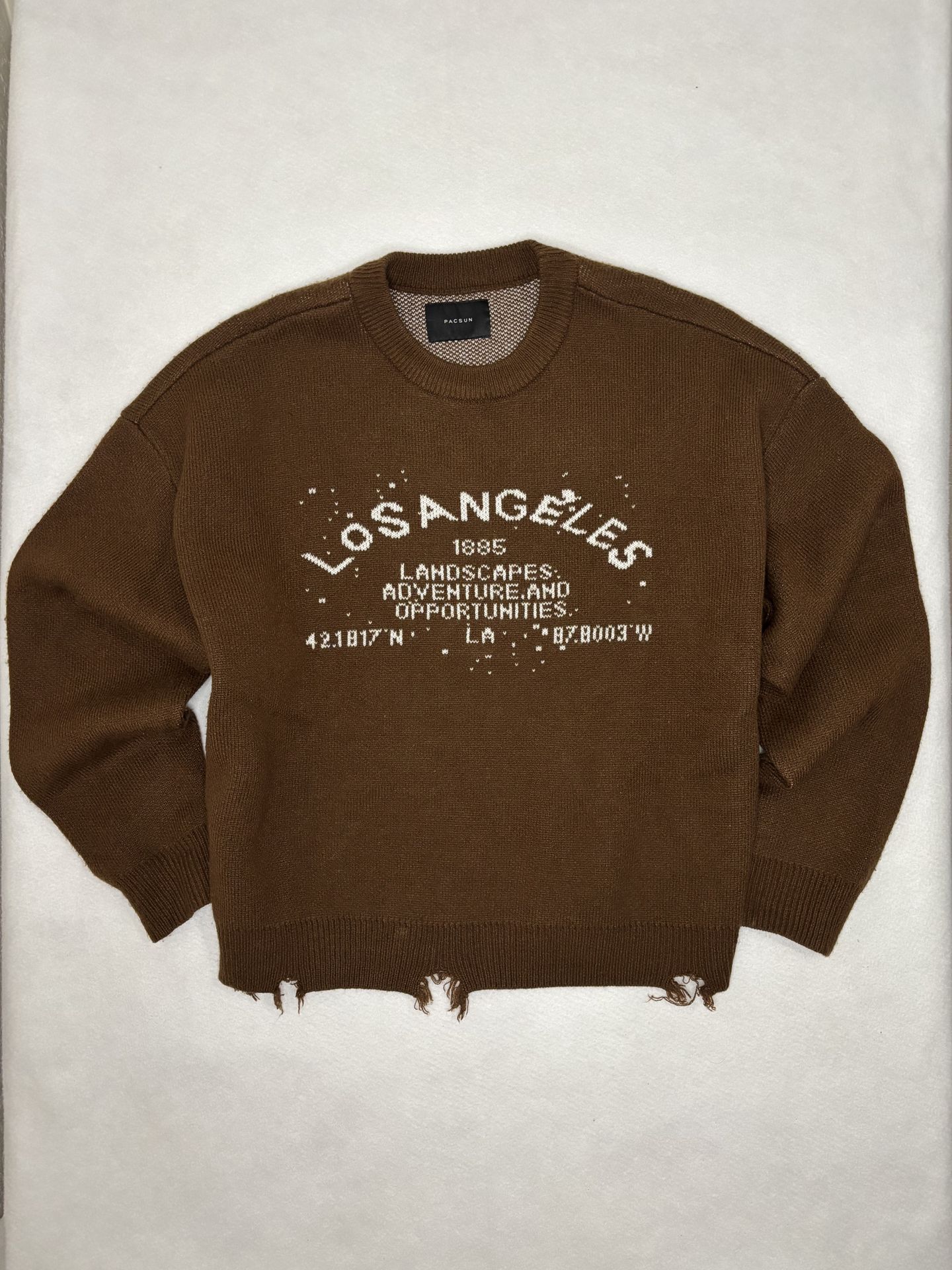 PacSun crewneck sweater in a rich brown knit features a distressed hem for a rugged, lived-in look. The front is detailed with a white intarsia graphic reading "Los Angeles 1885 Landscapes Adventure and Opportunities" along with geographic coordinates. Designed with a relaxed, oversized fit, dropped shoulders, and ribbed trim at the collar and cuffs.