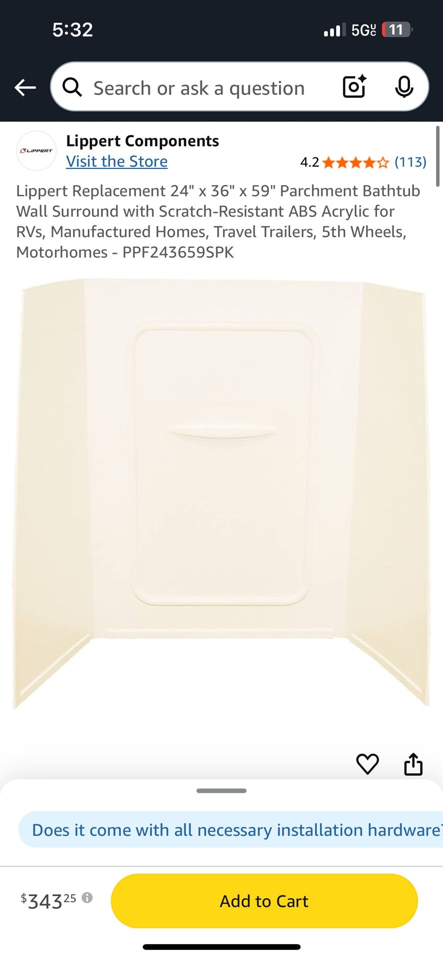 Lippert Replacement 24" x 36" x 59" Parchment Bathtub. New
