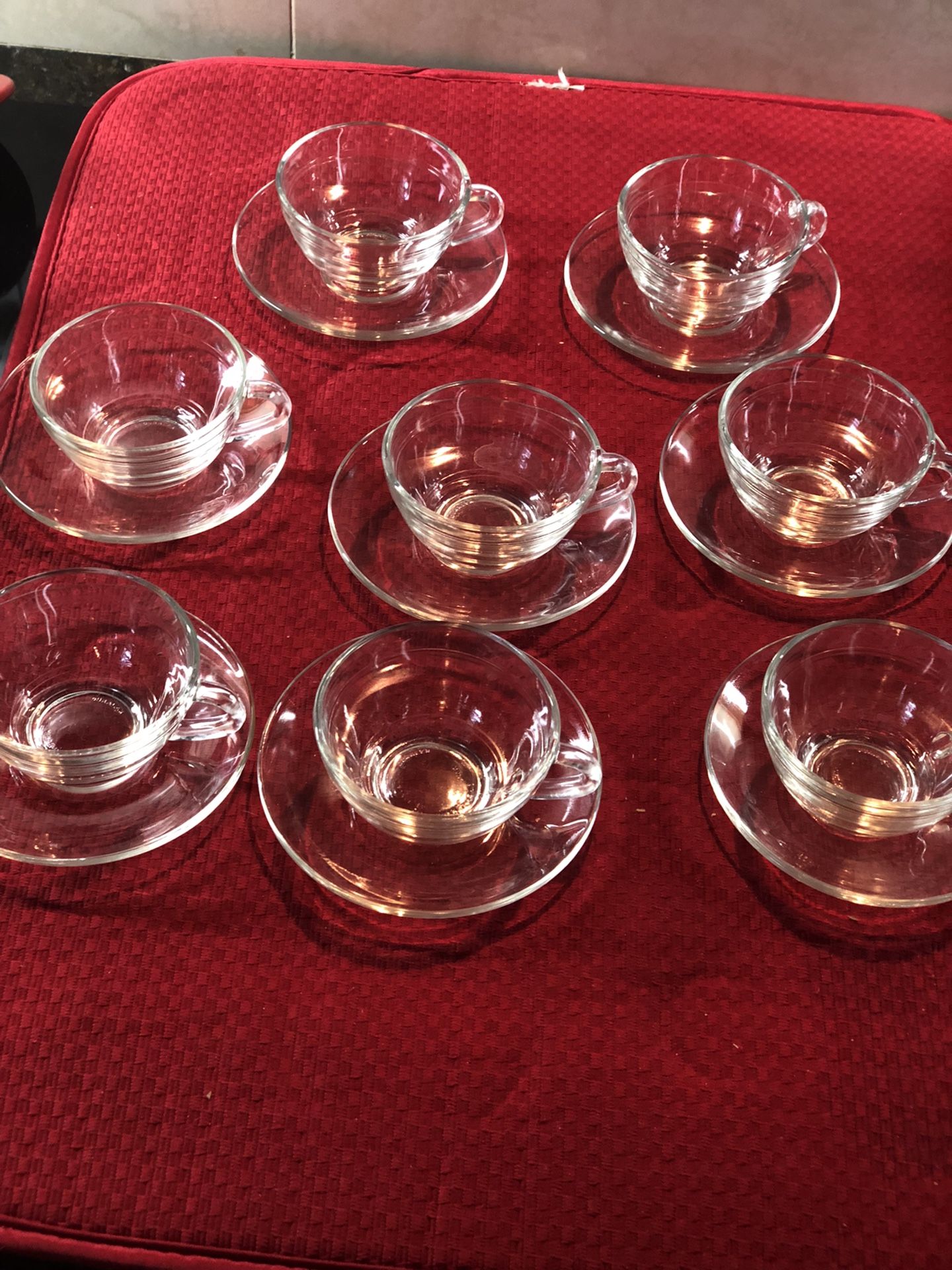 16 PIECE DEMITASSE SET SERVICE FOR 8 CLEAR GLASS ESPRESSO CUPS GREAT CONDITION NO CHIPS WHO WANTS ENJOY AN ESPRESSO CAFE’ BUSTELO - THE BEST !!!