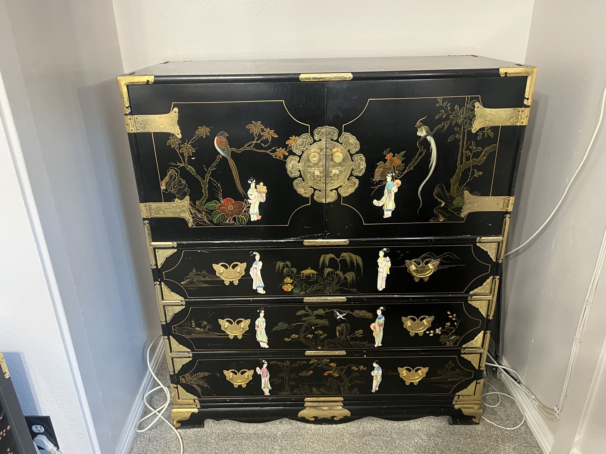 All reasonable offers entertained! Come pick up today!! 8 pieces in total. Black lacquer Asian themed vintage furniture. There is 1 Queen headboard, 1 long dresser, 2 side cabinets, 1 tall dresser, 2 mirrors, and 1 fan. See photos. Tall dresser: 72" x 18"d x 31-1/2" h 6 outside drawers, 4 inside drawers. Queen headboard, no frame, no mattress 62" x 24" with legs. fan Appx 53" x 30" Mirrors-2 44-1/2" x 21" x 1-1/4" d Small cabinets-2 24" x 16" x 24" h. Large/long dresser 72" x 18"d x 31-1/2" h 6 outside drawers, 4 inside drawers. In guest room, minimal wear. Smoke free home. Feel free to ask details.