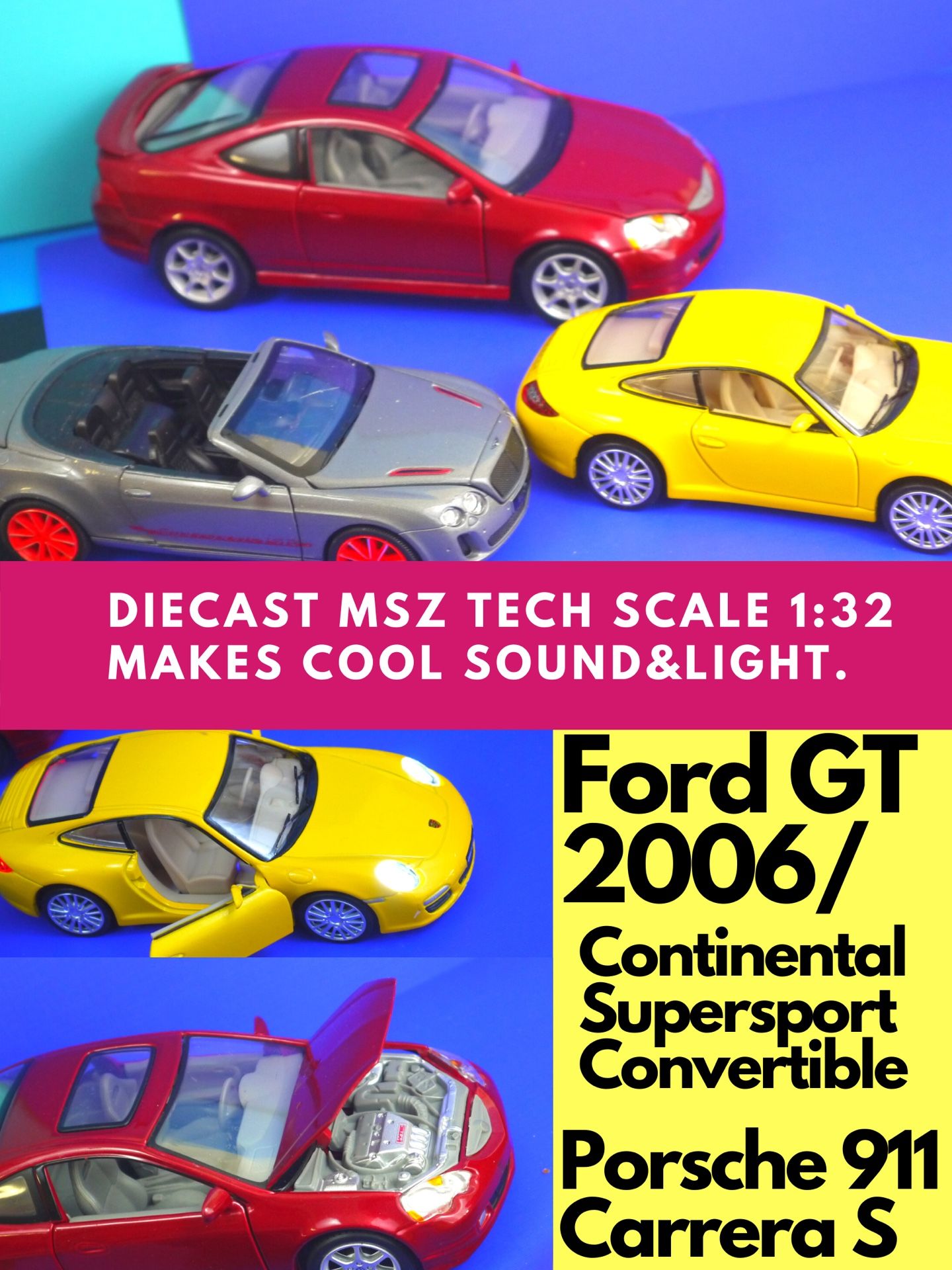 Bentley Continental Convertible 1:32 Sport Car/ Has a little detail in the windshield. Accura RSX S Maisto/ 1:24- Makes cool doing and π‘ light, Porsche Carrera 911 S - Makes Cool Sound & π‘ light.