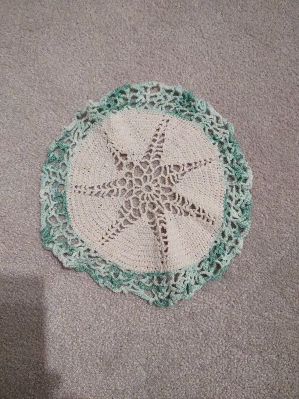 9" diameter Hand crocheted; greens around the outside. Non-smoking home I have other colors and sizes