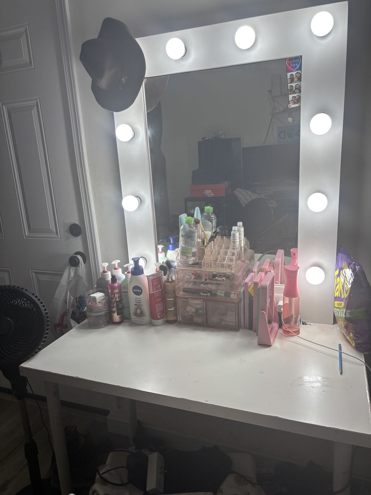 Good condition, minor scratches on the desk but nothing crazy . I used a mat to cover it. Selling cus I’m trying to downsize a bit .