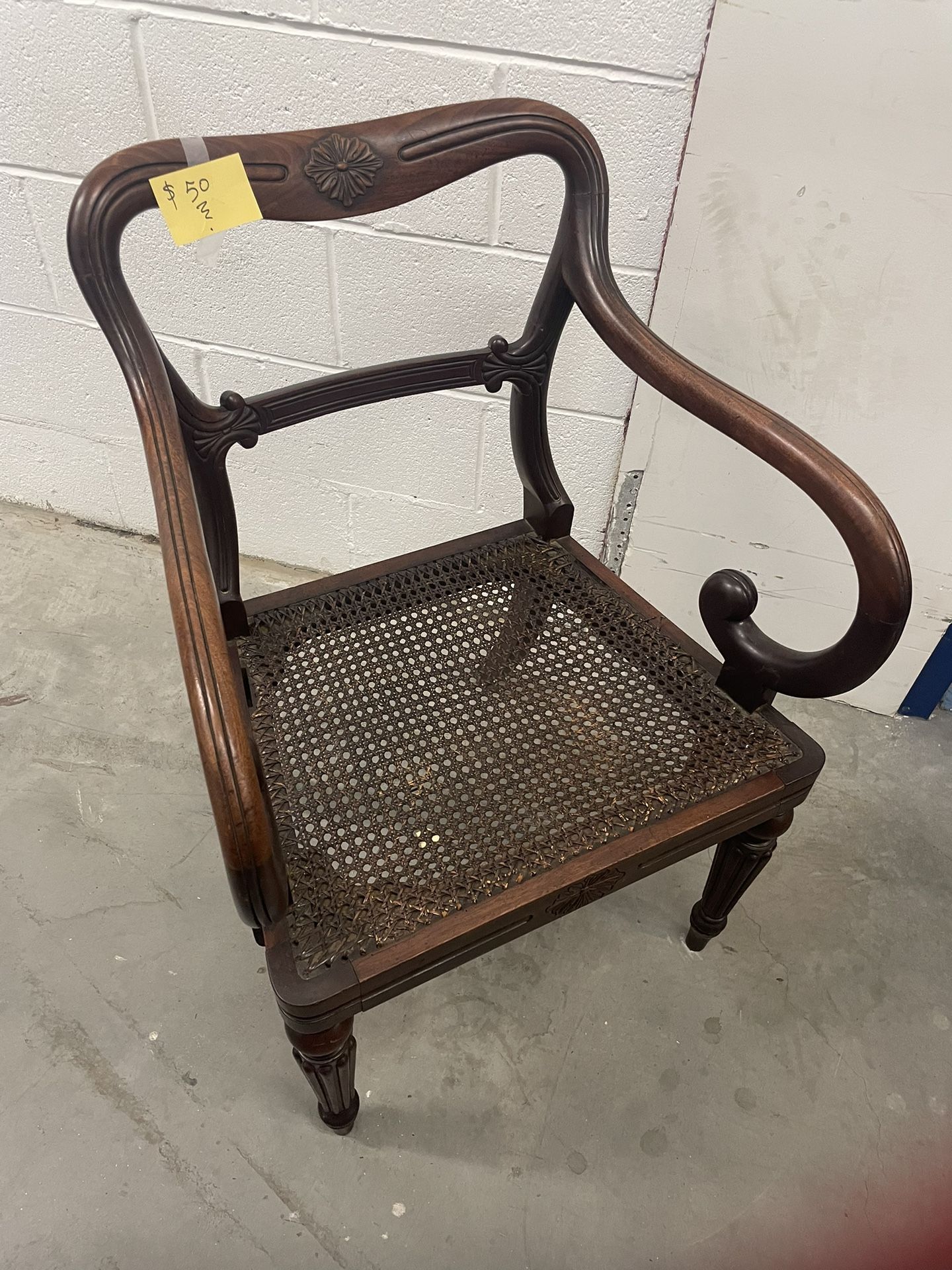 The chair is either mahogany or cherry is extremely well-made. The measurements are 22 wide and 20 inches deep and the height of the back of the chair is 32 tall is good condition. Located in my price is firm cash only $25